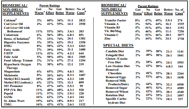 Source: Adams, J. B. (2013). Summary of dietary, nutritional, and medical treatments for autism based on over150 published research studies. Informally published manuscript, Arizona State University, Phoenix, Retrieved from http://www.laurapower.com/AutismTreatment 2013.pdf